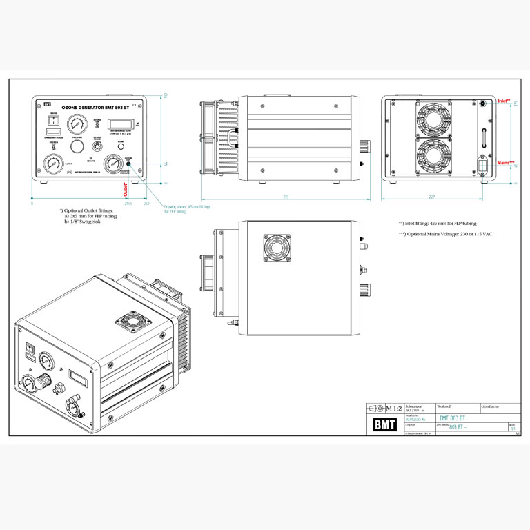 氧气入口:适配 4×6mm PTFE 管;臭氧出口:适配 3×5mm(1/8”×3/16”)PTFE 管;设备后部设 2 个在线端口,可连接可选臭氧分析仪(BMT 964)